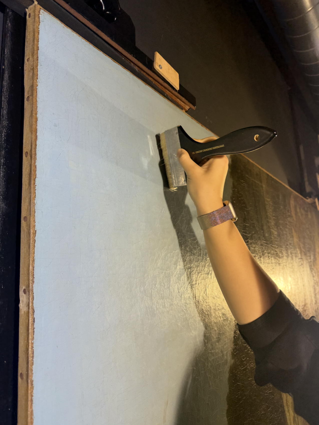 Final Coating: A final layer of the same 20% Dammar varnish was applied to provide a uniform gloss and create a protective barrier against future atmospheric deposits and mechanical wear.