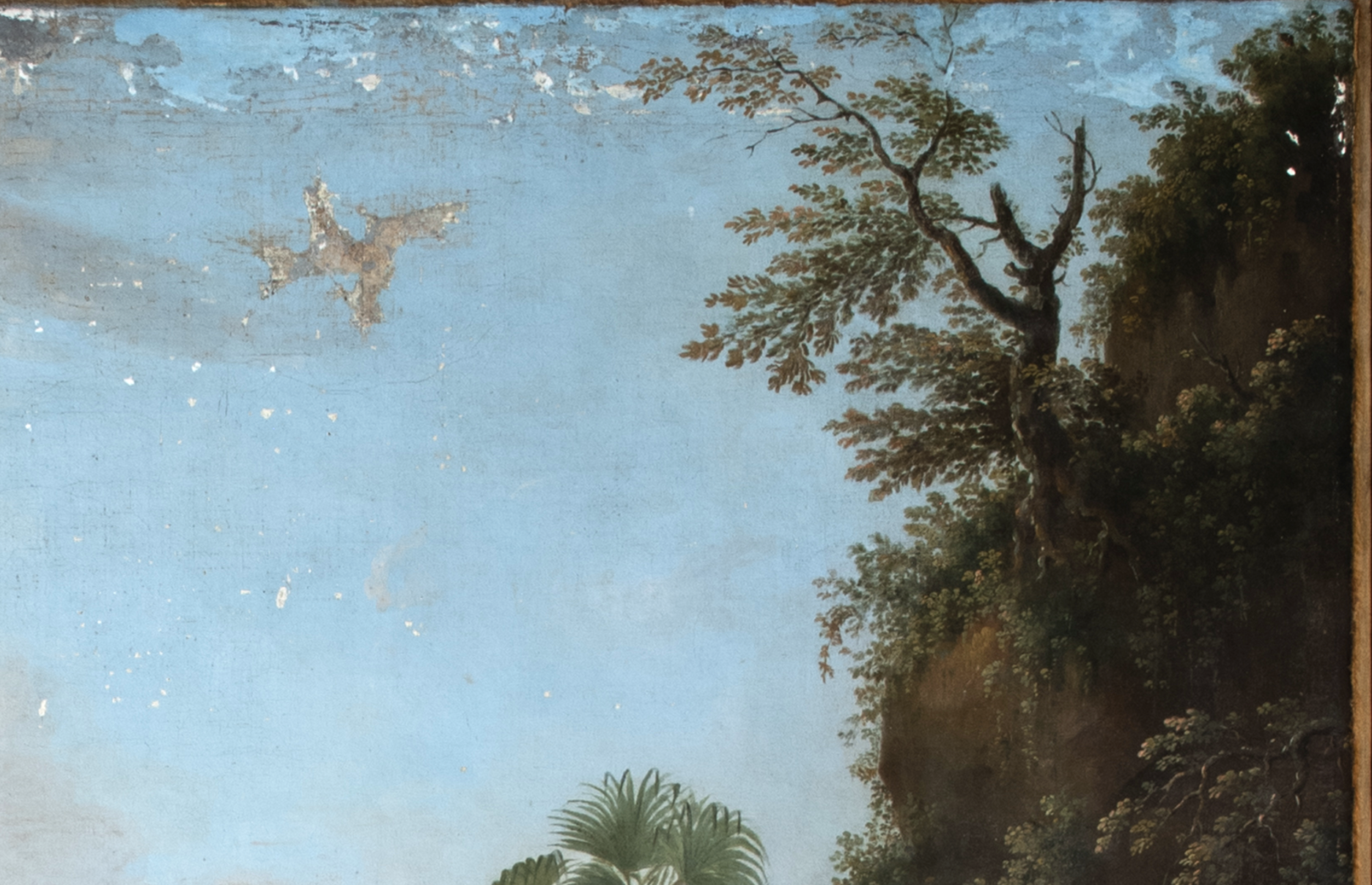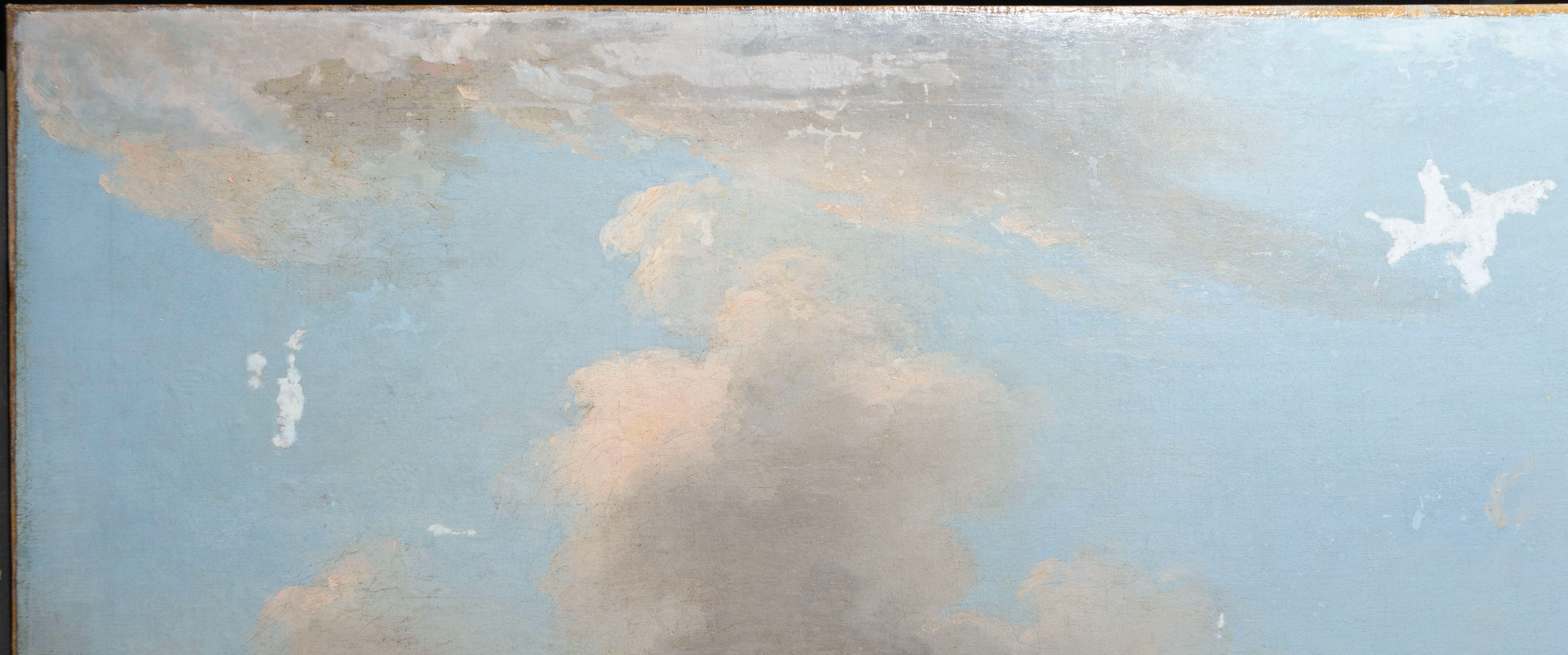 The painting shows extensive needs for large-scale filling, where losses need to be carefully fillsed and texturized in order to achieve a seamless transition, and integration with the surrounding surviving matertials.